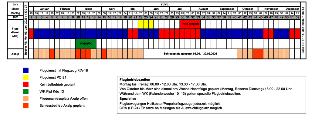 Geflogen wird in der Schweiz von Montag bis Freitag immer zwei Mal täglich. Die Morgenrunde findet zwischen 08.00 Uhr und 12.00 Uhr, die Mittagsrunde zwischen 13.15 Uhr und 17.00Uhr statt! Die Deutsche Luftwaffe verfährt hier nahezu gleich zu den Zeiten der Schweizer Luftwaffe!